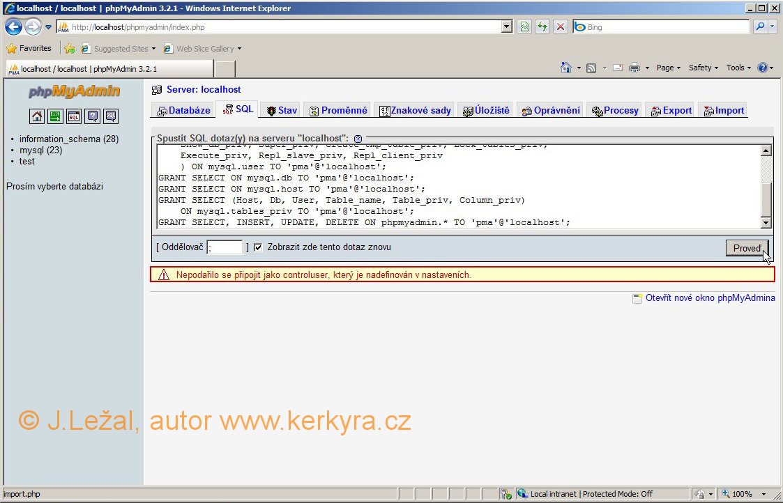 Vrátíme se do otevřeného PHPMyAdmin v prohlížeči a klikneme na prostřední ikonu SQL (nebo na záložku SQL). Do otevřeného okna zkopírujeme celý obsah z paměti pomocí kombinace kláves CTRL+V a poté klikneme na tlačítko Proveď.