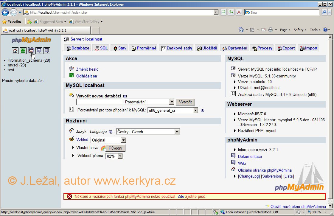 Vidíme, že zmizela i druhá chybová hláška = máme nainstalované prostředí pro správu databází PHPMySQL včetně rozšířených možností.
