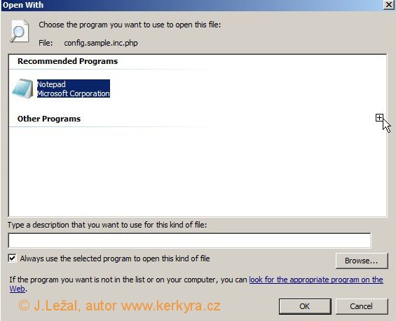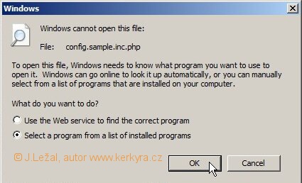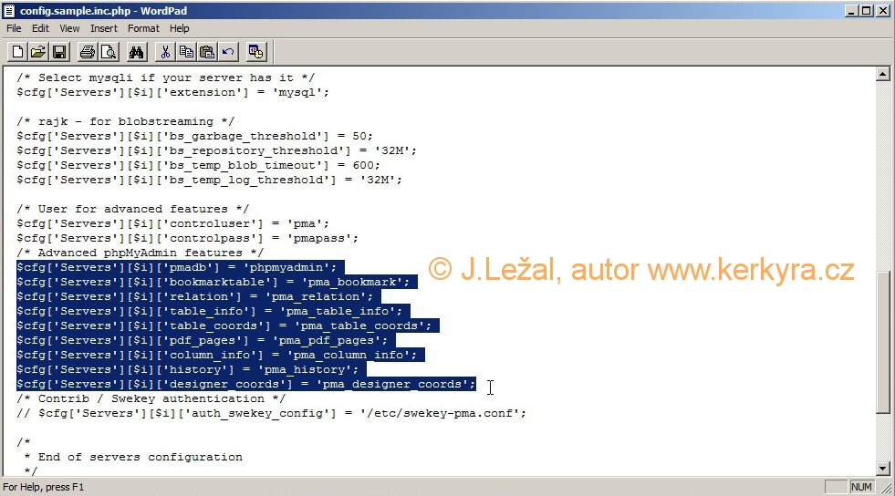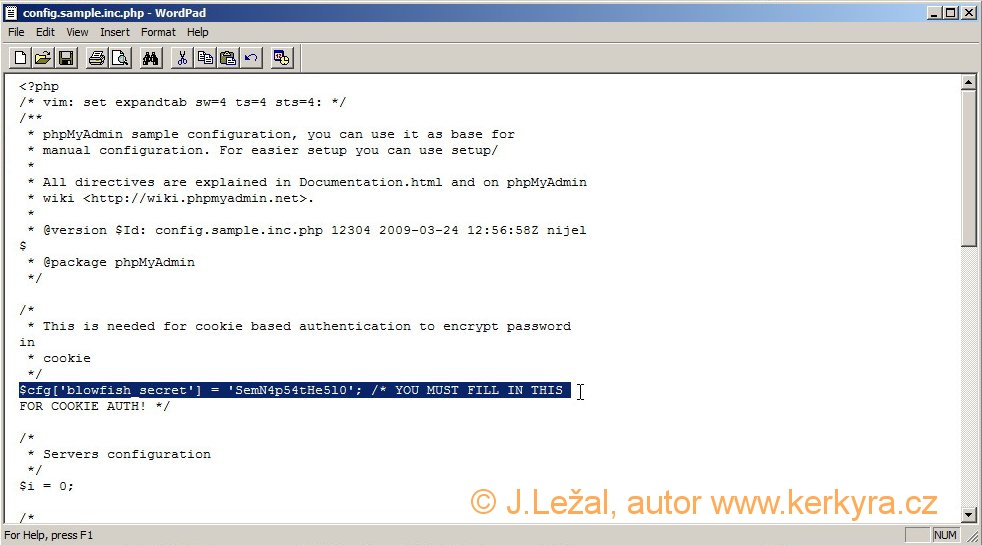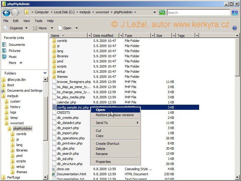 Průzkumníkem (Win+E) přejdeme do složky kde máme připravený PHPMyAdmin, tedy v našem případě C:\inetpub\wwwroot\PHPMyAdmin a tady najdeme soubor config.sample.inc.php. Ten buď rovnou přejmenujeme a nebo zkopírujeme a změníme jeho název na config.inc.php. Pak otevřeme ale POZOR, nikoli Notepadem, ale pomocí Wordpadu! Notepad soubor zobrazí totiž pohromadě bez odřádkování.