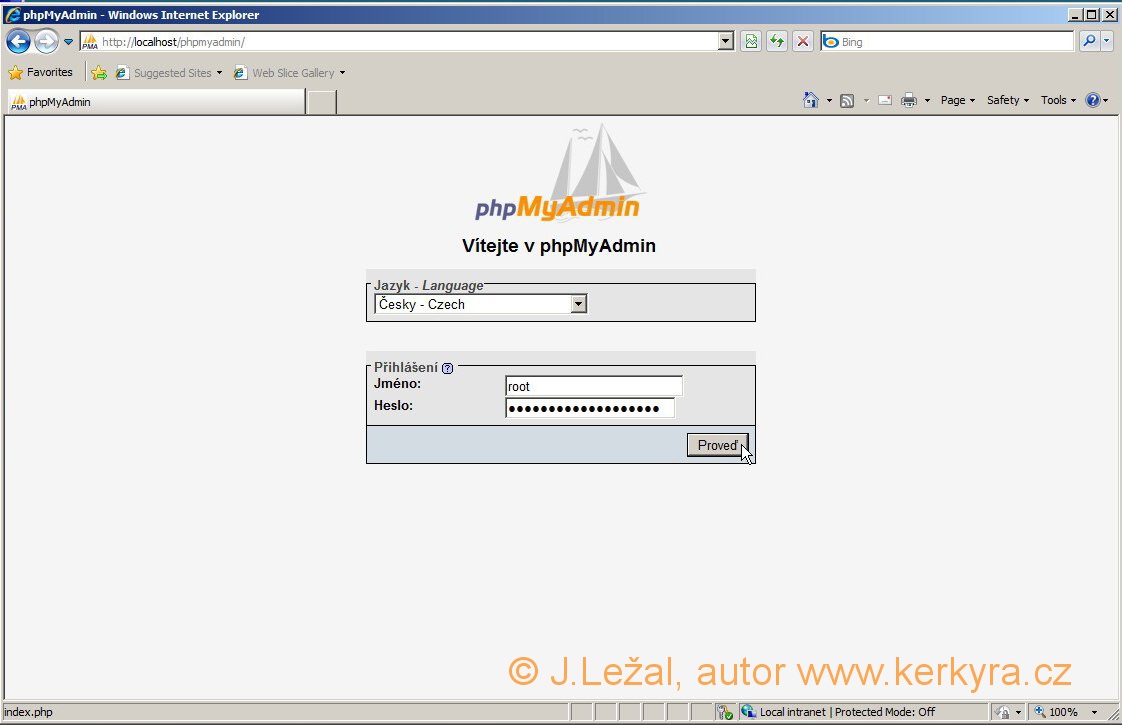 A přihlásíme se jako root s heslem které jsme zadali při vytváření MySQL databáze.