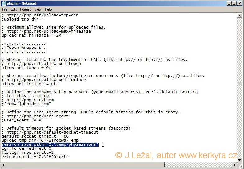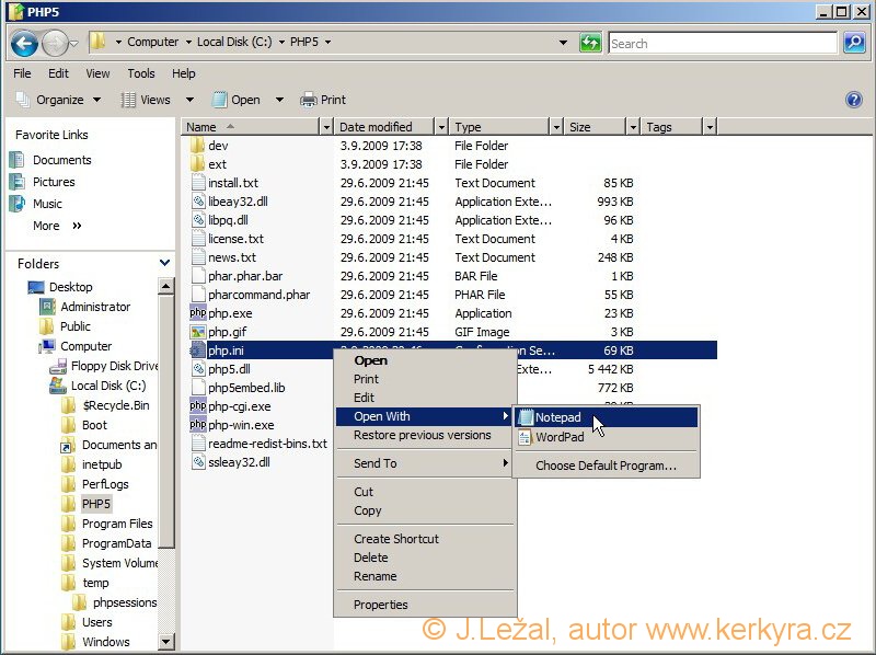 Pomocí průzkumníka (Win+E) přejdeme do složky kde máme nainstalovaný PHP (C:\PHP5\)a otevřeme soubor PHP.ini pomocí Notepadu.