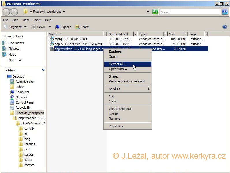 Z Adresy https://www.phpmyadmin.net/home_page/downloads.php stáhneme poslední verzi (v našem případě soubor phpMyAdmin-3.2.1-all-languages.zip) a uložíme k ostatním staženým souborům do složky Pracovni_wordpress na ploše. Po stažení si necháme složku rovnou otevřít tlačítkem Open Folder. Na stažený soubor klikneme pravým tlačítkem myši a vybereme Extract ALL…
