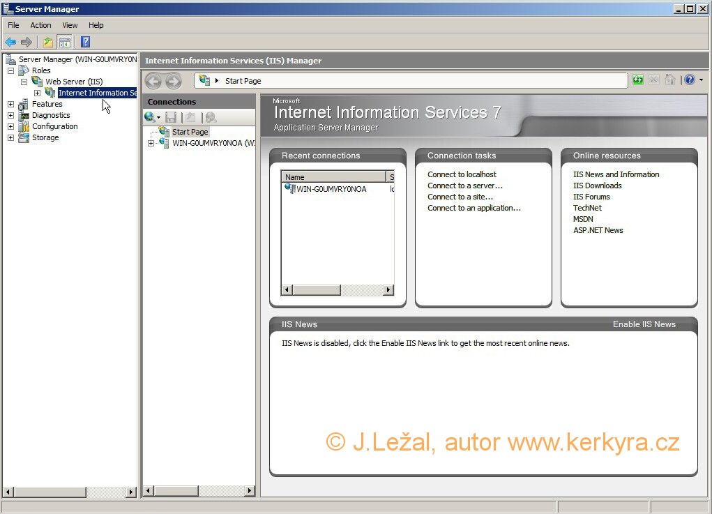 Pokud byl dodržen předchozí postup není potřeba následný krok dělat, je již proveden. Pokud ne, pak Otevřeme Server Manager (hned vedle Start) , vlevo rozklikneme Roles, následně Web server (IIS) a klikneme na Internet Information Service (IIS) Manager.