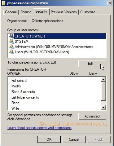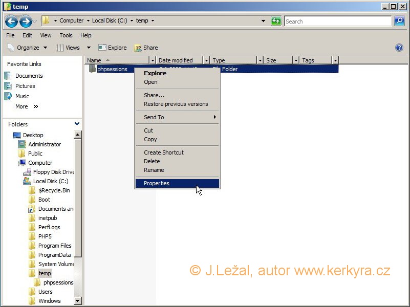 Pomocí kláves Win+E otevřeme průzkumníka a na disku C: vytvoříme složku Temp a pod ní podsložku phpsessions. Na vytvořenou složku klikneme pravým tlačítkem myši a vybereme vlastnosti (Properties).