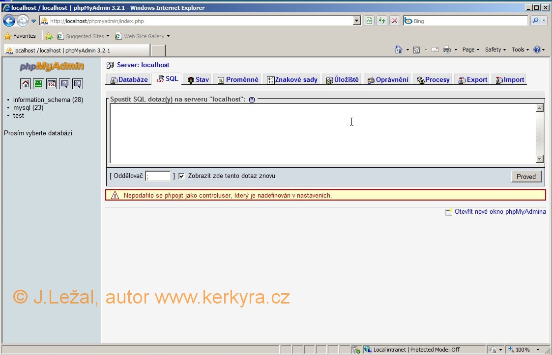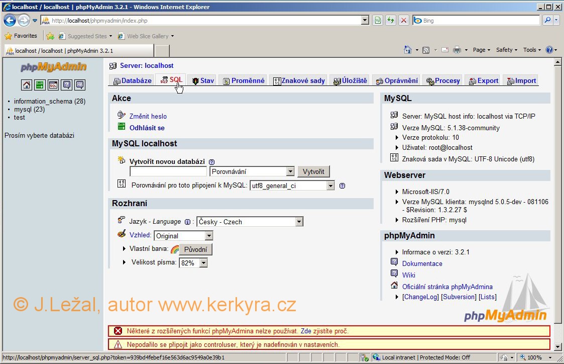 Otevře se nám úvodní obrazovka PHPMyAdmin na níž dole vidíme dvě chybové hlášky: